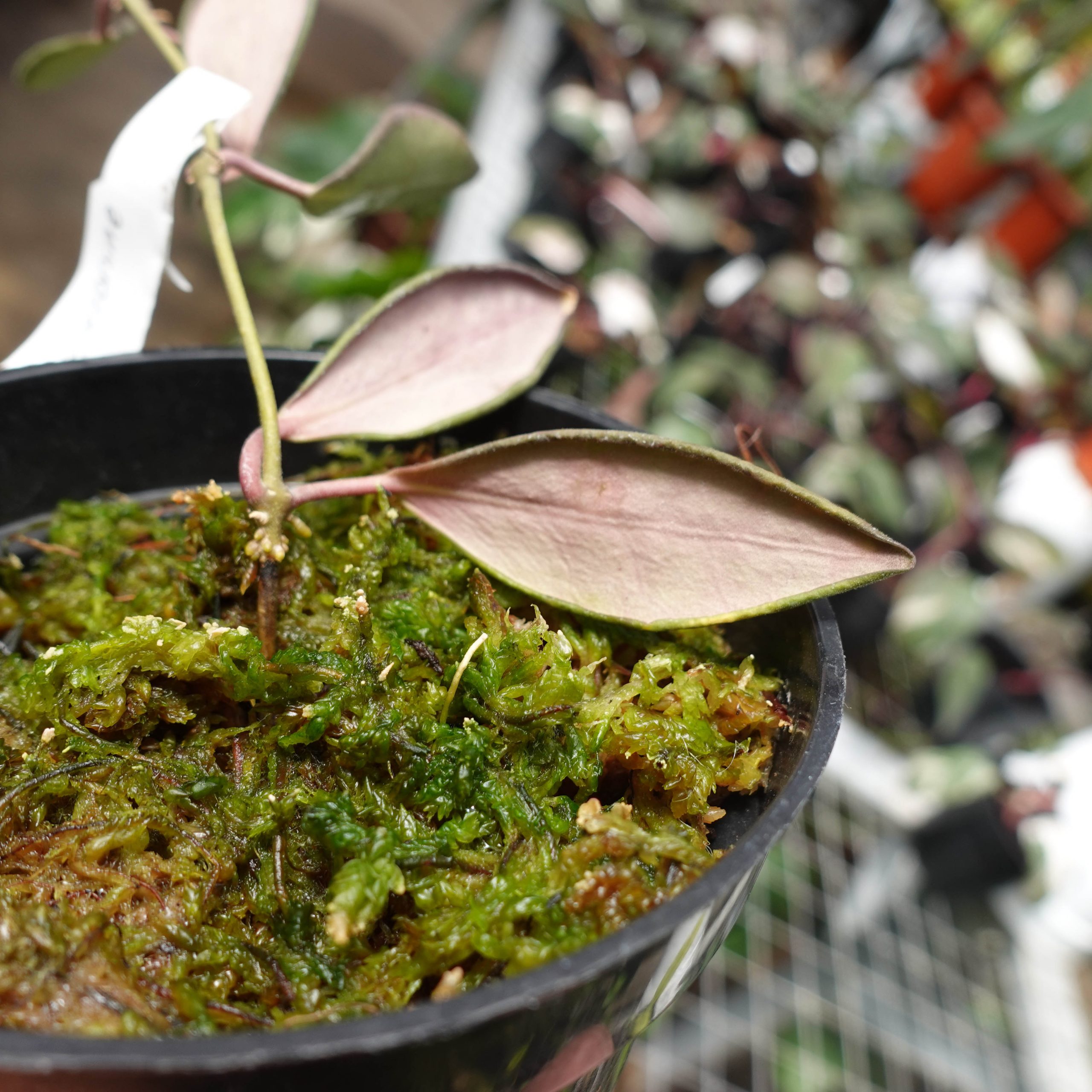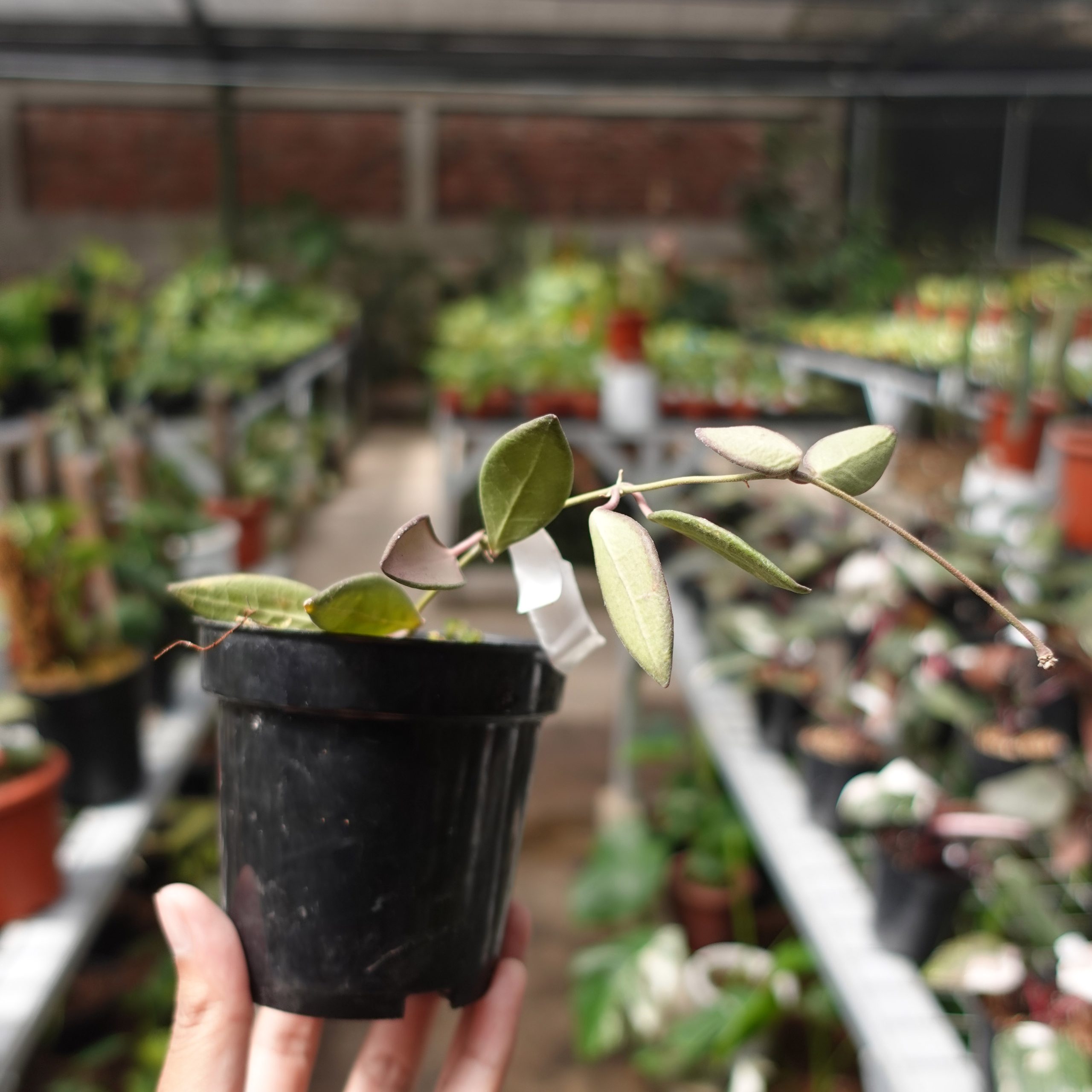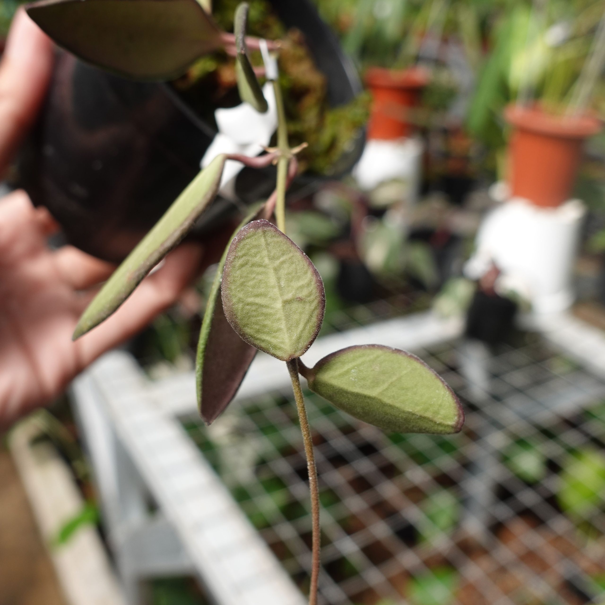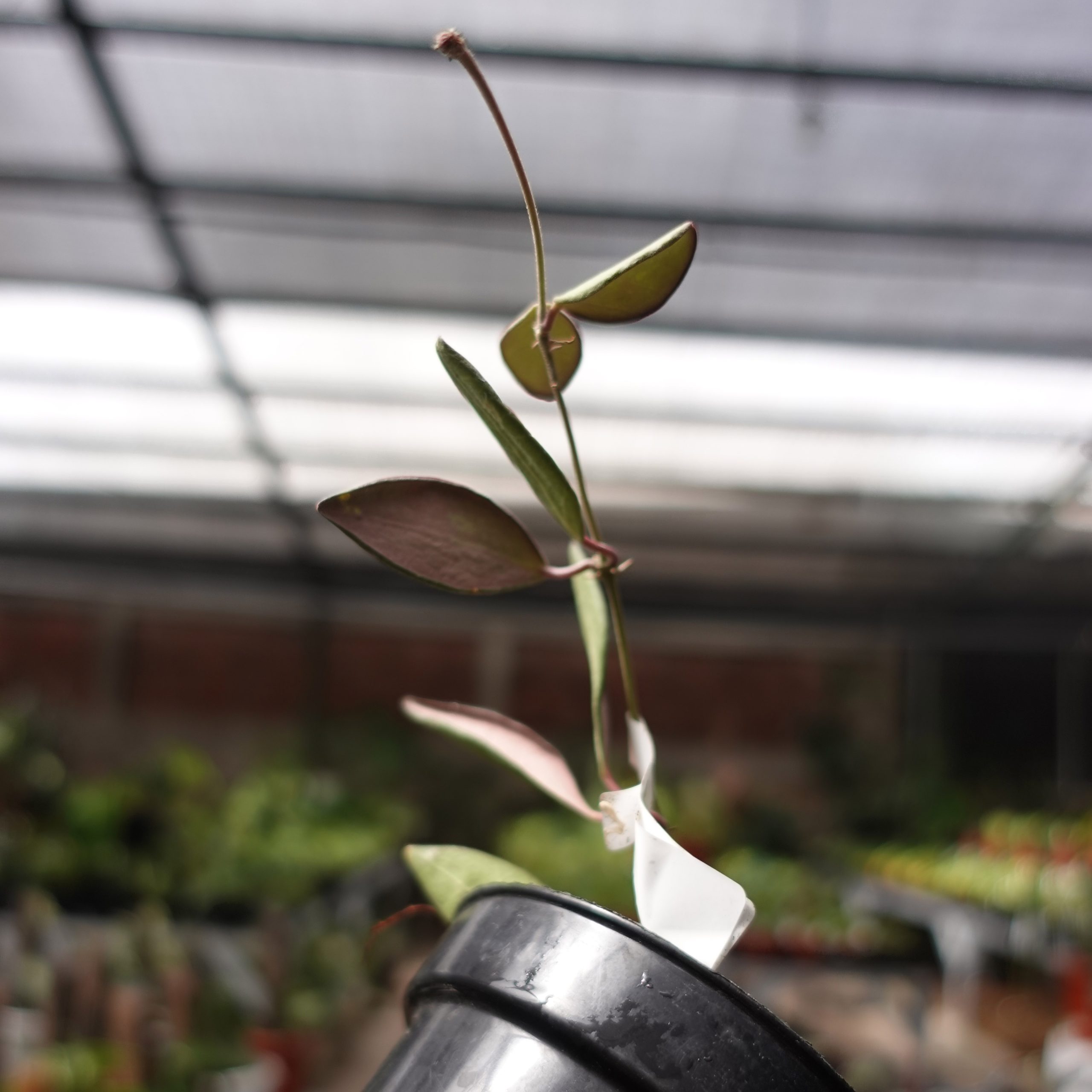 Hoya aff Burtoniae features small, dark green leaves and clusters of reddish-pink flowers. It’s a trailing plant, perfect for hanging baskets, adding color and greenery to indoor spaces.