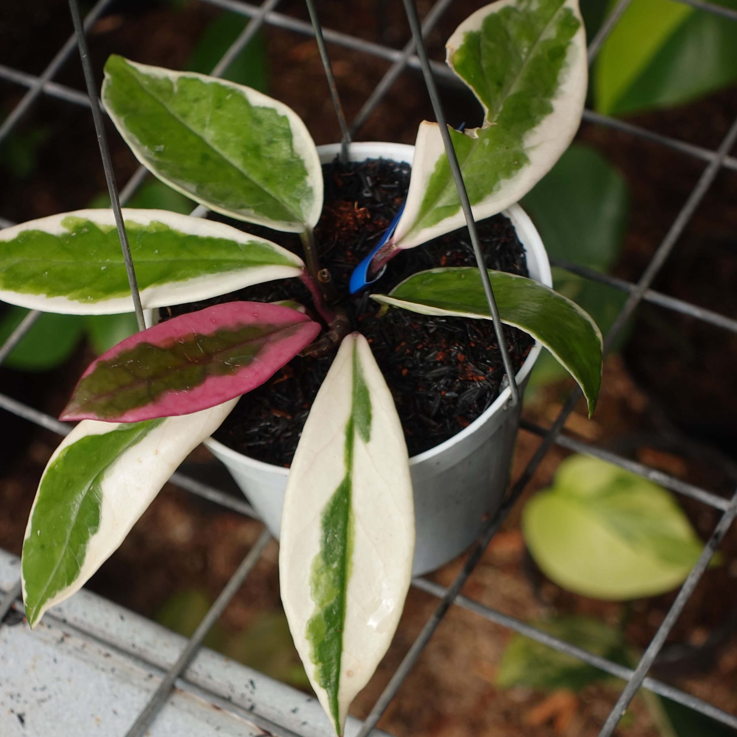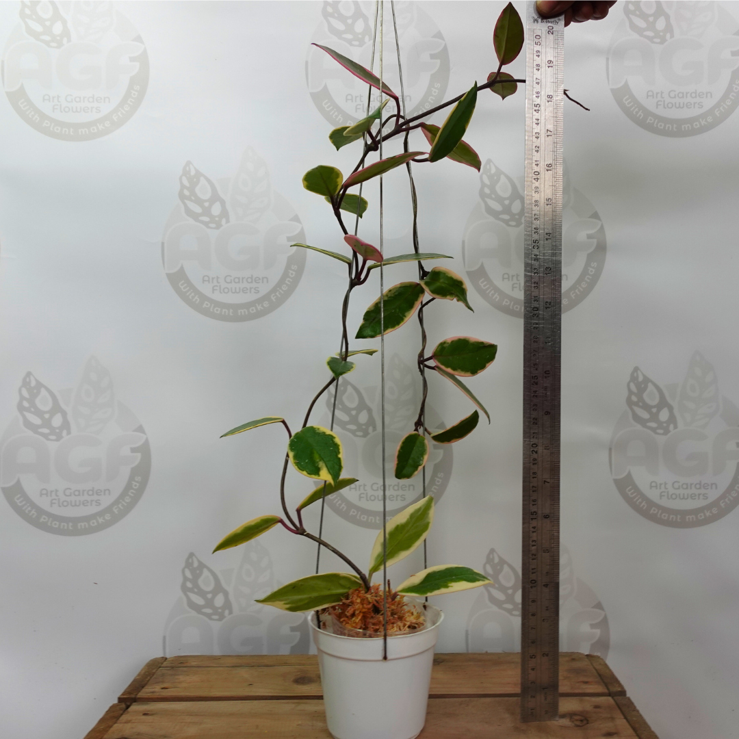 The Purple Pride variant has distinctive and interesting characteristics. Hoya Carnosa Purple Pride leaves have an oval shape with tapered tips. The leaves are thick and glossy with a dark green color that contrasts with the white or silvery marble motif in the center. However, what sets Purple Pride apart is the presence of shades of purple on certain parts of its leaves, giving it an interesting touch of color. The flowers are shaped like stars with a small crown in the center. It is easy to maintain and prefers a location with bright light but not direct exposure to strong sunlight. They are also drought-tolerant but should be watered regularly without waterlogging the roots.