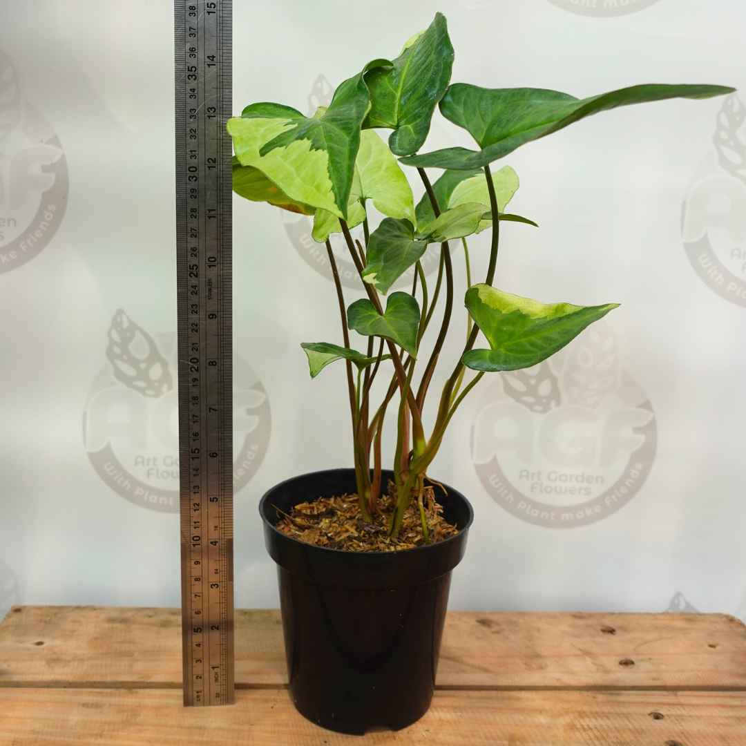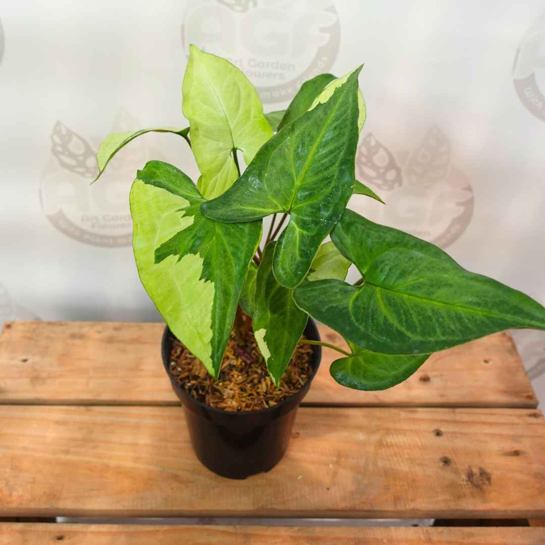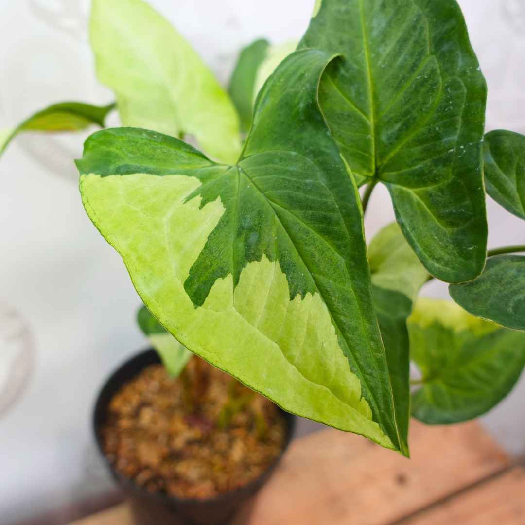 Syngonium Thrikings is a unique and sought-after Syngonium cultivar, renowned for its striking variegated foliage. The leaves of Syngonium ‘Three Kings’ are usually arrowhead shaped, similar to other Syngonium varieties. The leaves display a mix of colors, often including shades of green, white, and yellow. The variety can be very contrasting, with white or yellow spots or stripes on a green background.